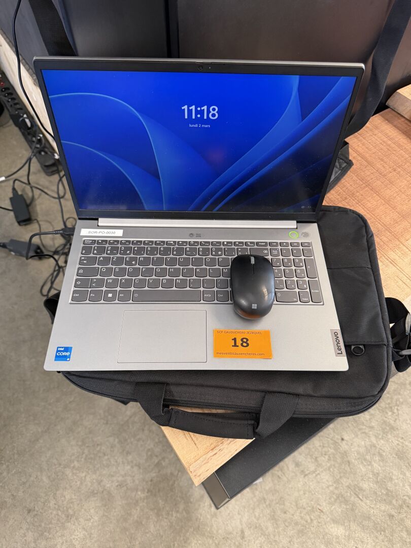 PC portable LENOVO ThinkBook, n° série donné à titre indicatif : MP2C1A0Q, core i5, 2022 (s'allume, non réinitialisé, mot de passe inconnu), chargeur, sacoche, souris sans fil (sans plug)