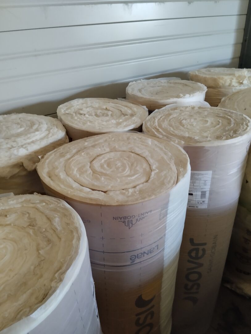 19 Rouleaux d'isolant ISOVER (200 et 240), 6 Ballots de fibre de bois pour insufflation GUTEX, 2 Rouleaux de carton de protection, 6 Ballots de Thermofibre GUTEX, 3 Rouleaux de laine de roche KLAUFINSULATION (2 x 240, 1 x 120), 1 rouleau de laine de roche en 260 URSA, 1/2 Rouleau d'isolant 35 ISOVER