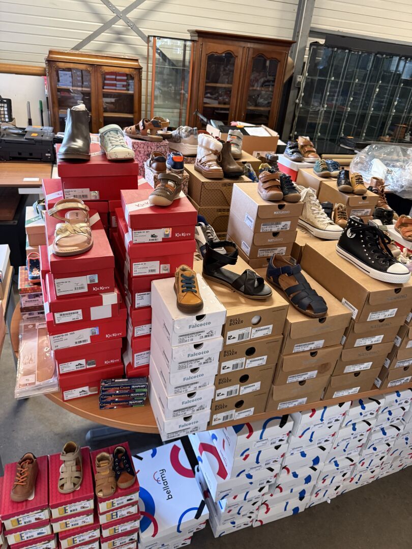 Stock d'environ 230 paires de chaussures enfants pointures 19 à 38 dont sandales, bottines, baskets, claquettes, de marques KICKERS, BELLAMY, FALCOTTO, BULL BOXER, SHOO POM, PLAY ONE, STONES AND BONES, B & BONES