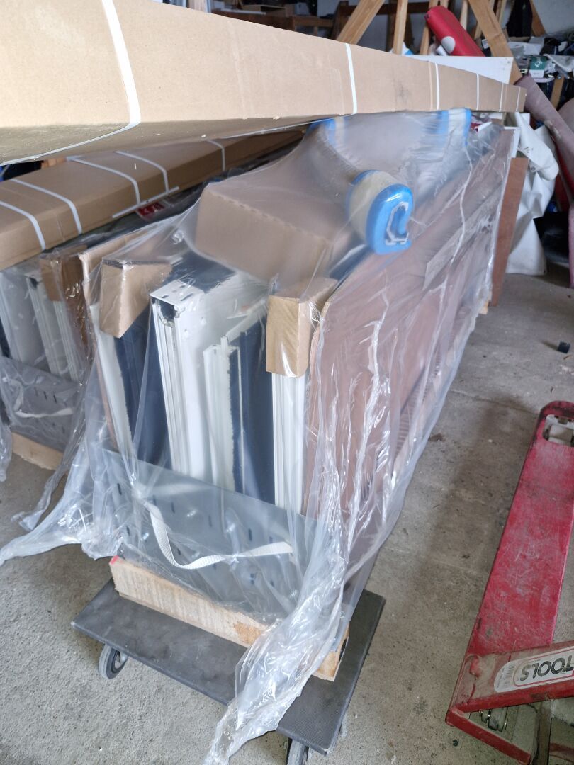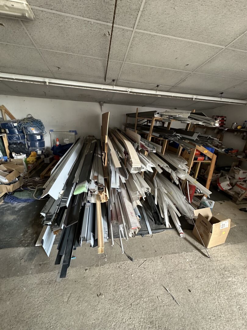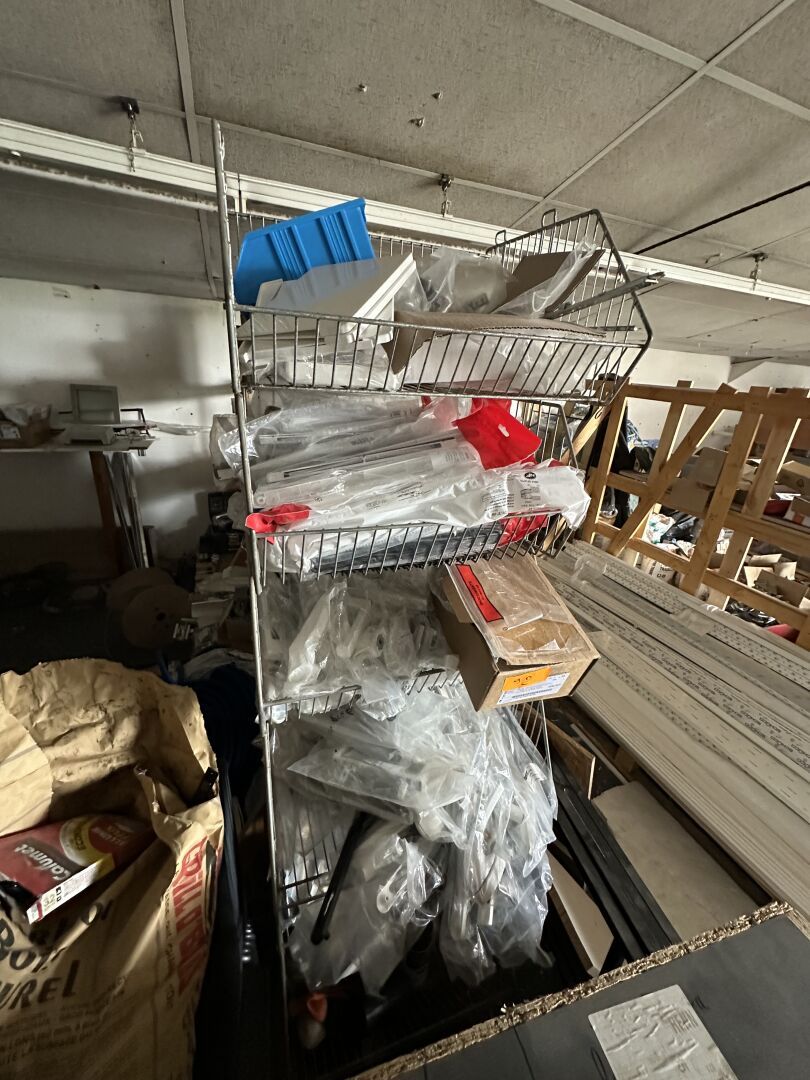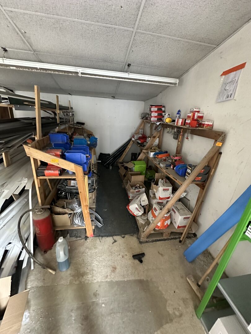 Contenu de 3 palettes : Appareillage LEGRAND, Visserie, Boulonnier, Tube de silicone, Boîte de dérivation, Forêts et Outillage.