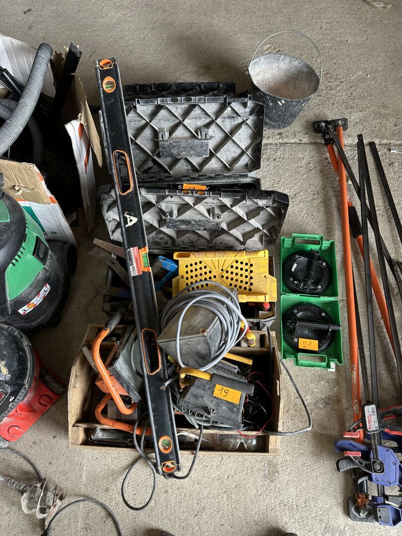 Ensemble de 4 Caisses à outils (3 STANLEY et 1 en bois) garnies d'outils : tournevis, marteaux, casques anti-bruits, scie, 2 phares de chantier, 2 testeurs, 1 niveau