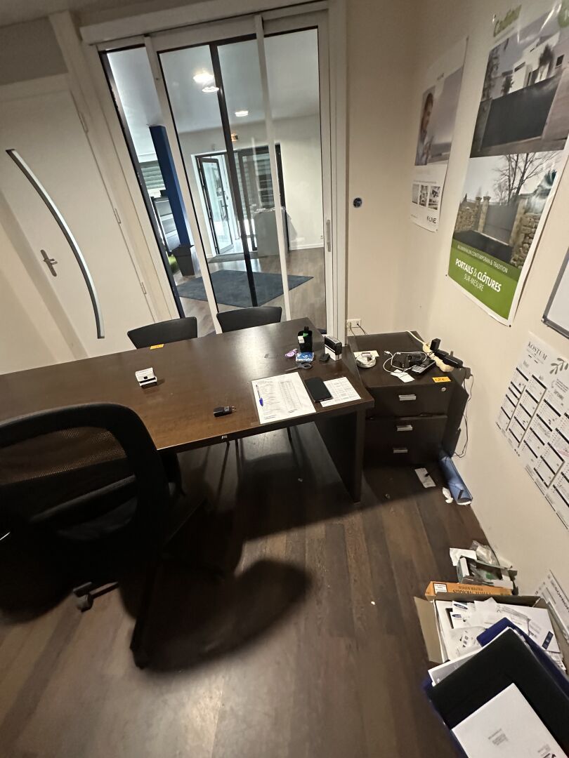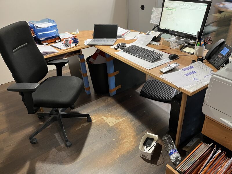 Bureau stratifié bois, Chaise sur roulettes, 2 Sièges visiteurs