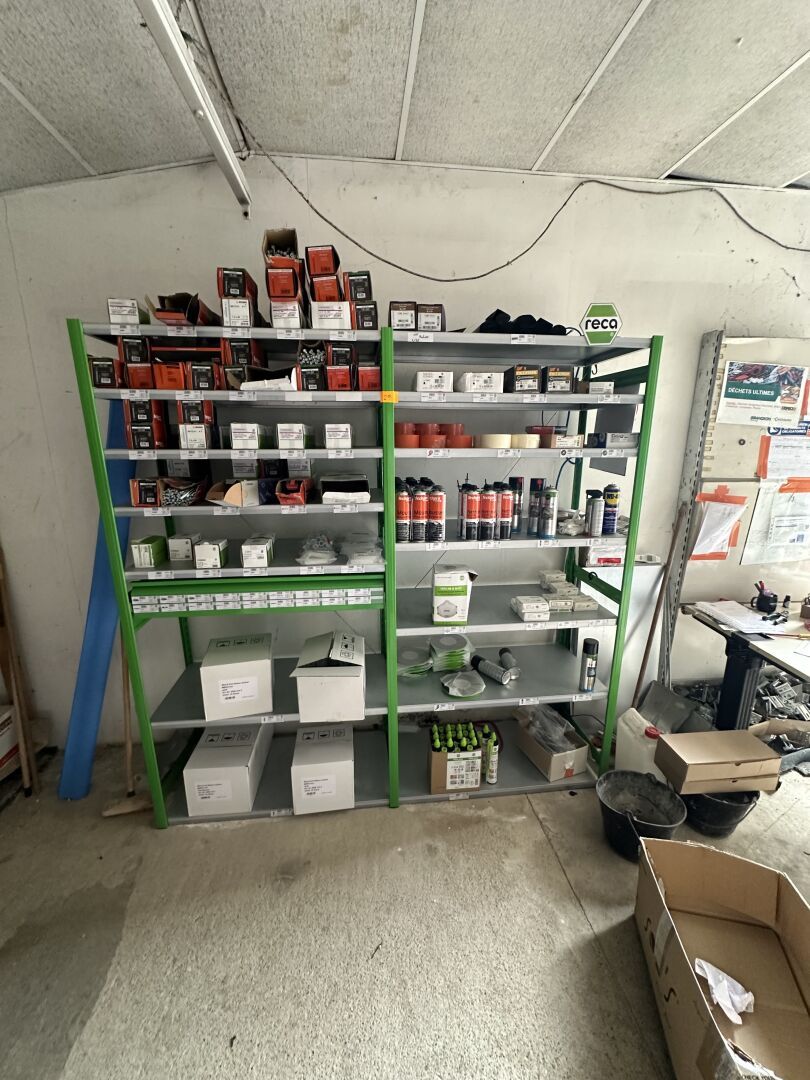 Etagères vertes RECA garnies de produits, silicone, mousse polyuréthane, visseries, wago, WD 40, VMU plus