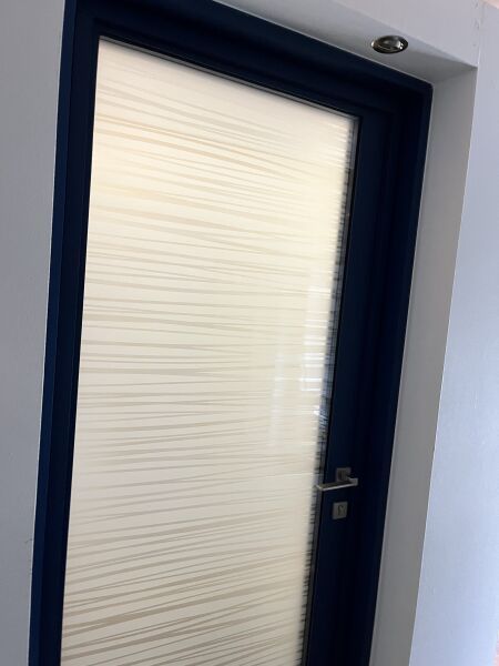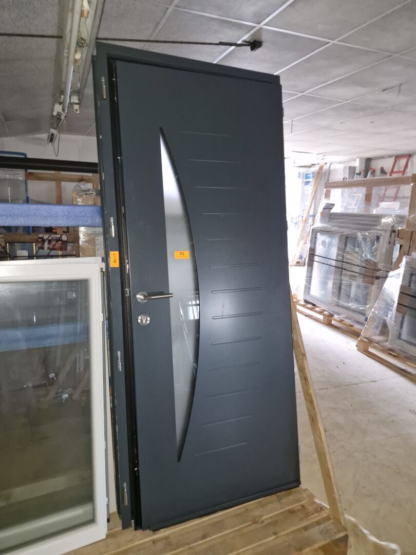 Porte vitrée K LINE, serrure 5 points à relevage alu monolaqué bleu extérieur blanc intérieur