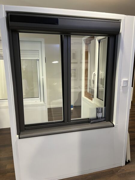 Fenêtre 2 vantaux PVC blanc intérieur, alu gris extérieur avec volet roulant électrique, télécommande
