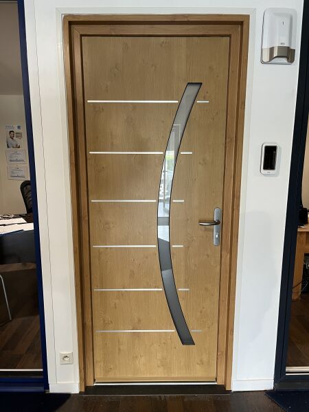 Porte d'entrée imitation chêne doré FENETRA aluminium avec visuel au centre