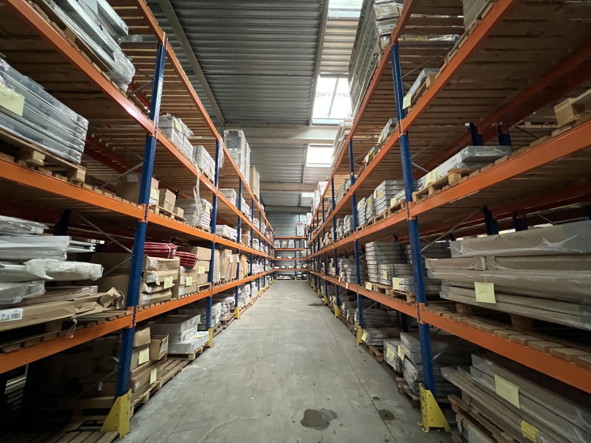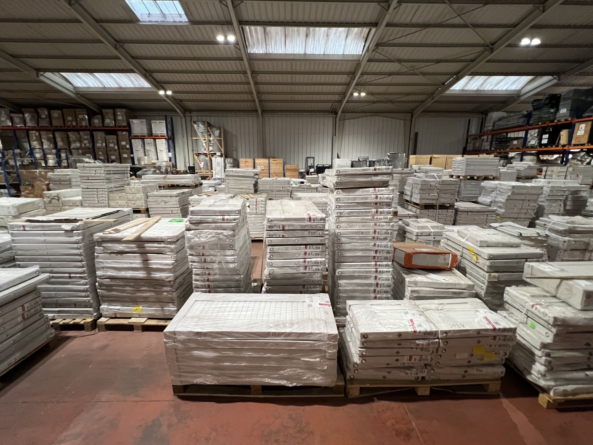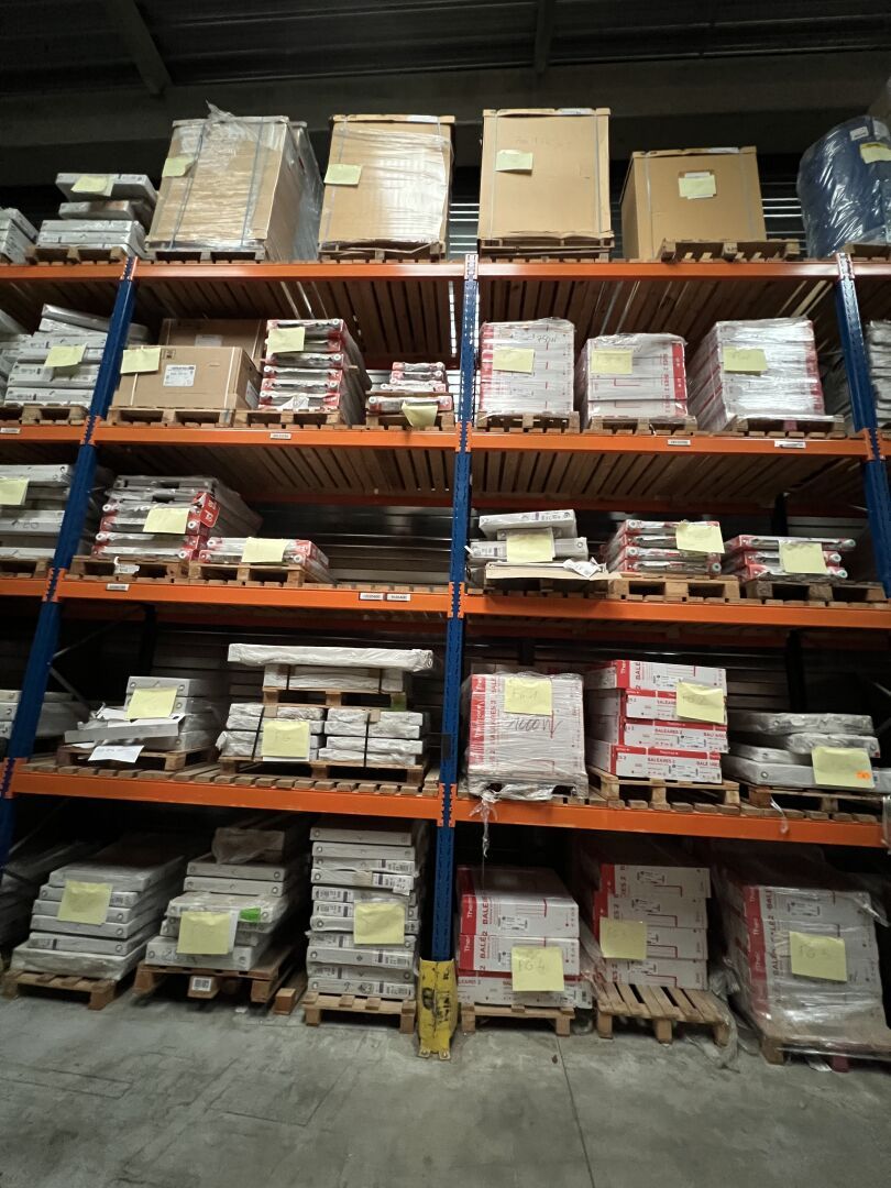 Stock de chauffagiste dont nombreux radiateurs, chauffe-eaux et accessoires de plomberie situé dans les locaux de l'entreprise Zac Val D'orson, 22 Rue du Passavent, 35770 Vern-sur-Seiche, France : :